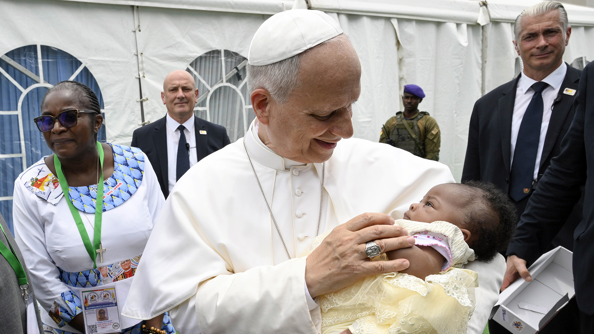 Pouco antes, durante a cerimônia de despedida no aeroporto camaronês, Leão XIV — que chegou após o término da missa celebrada no aeroporto de Yaoundé-Ville —, juntamente com o primeiro-ministro de Camarões, Joseph Dion Ngute, ouviu a execução dos hinos. Com a guarda de honra posicionada, seguiram a pé por um longo tapete vermelho até a base do avião, saudando as diversas autoridades institucionais e eclesiásticas presentes.