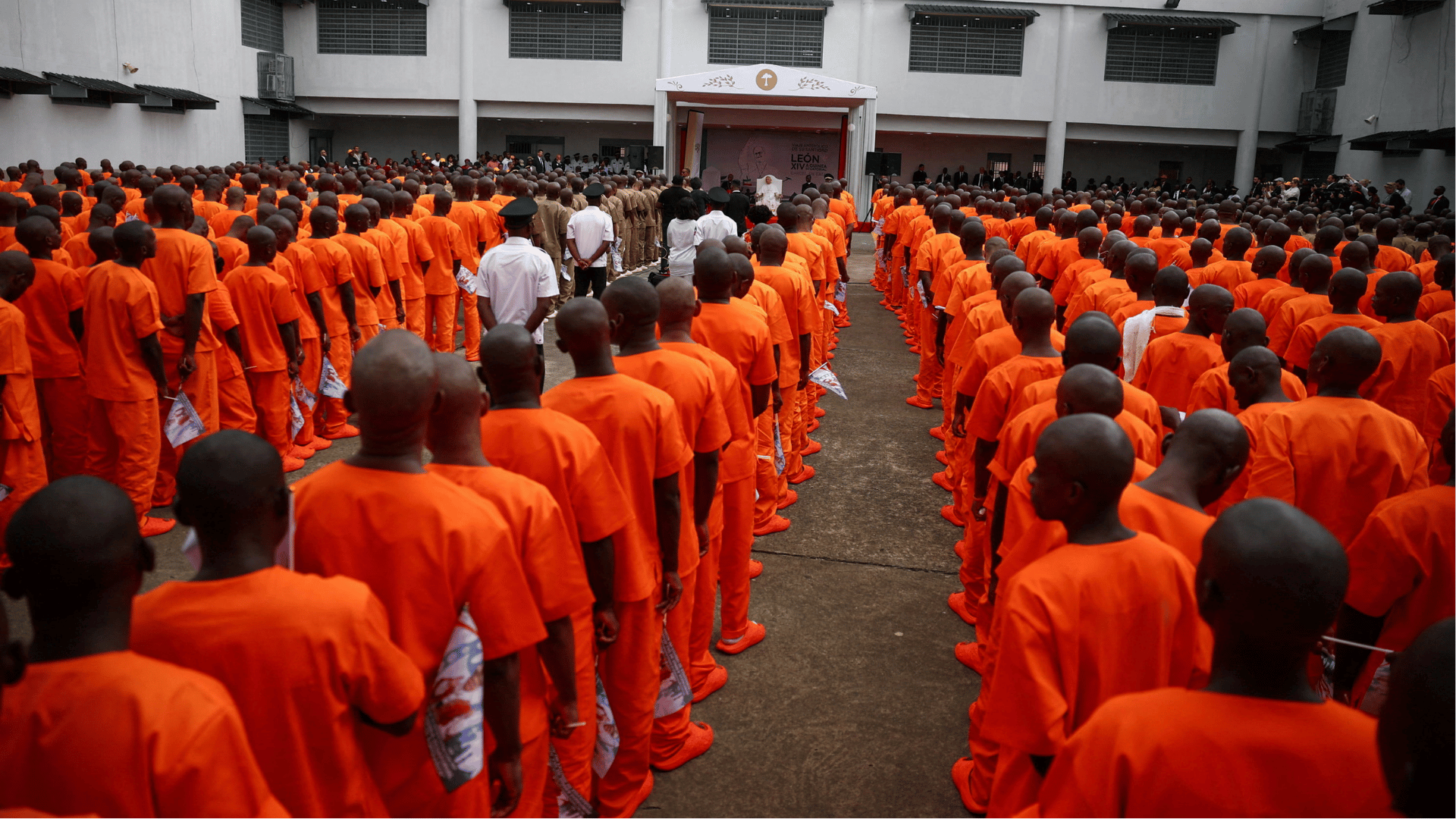 Detentos em fila no pátio do presídio de Bata em encontro com o Papa Leão XIV / Foto: REUTERS/Guglielmo Mangiapane